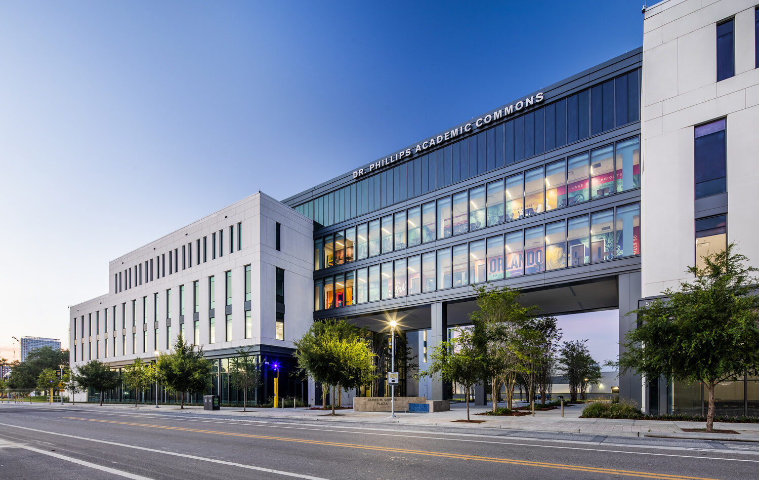 The 149,000 SF Dr. Phillips Academic Commons is the first building on the urban campus. This four-story classroom building hosts resources for digital media, communication, public service and health programs for students at both UCF and Valencia College. These classrooms, laboratories and offices are conveniently located within a half-mile of the city’s main public transportation hub.