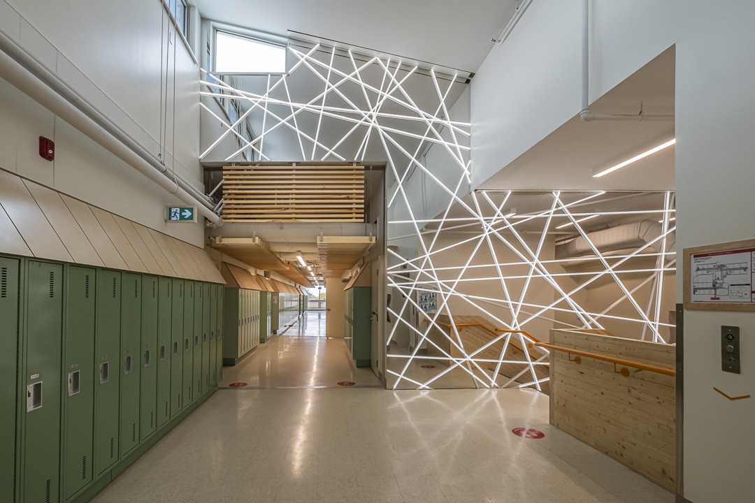 The expansion and reconfiguration of the Fernand-Séguin Primary School is a first in decades for the Montreal School Services Center. Comprised of light wood framing and engineered wood, the expansion of the Hubert-Reeves Pavilion provides a warm, engaging and space-saving educational environment. The 2,311 m² building’s two-floor design reduces its footprint and allows for larger outdoor spaces. An agora connects the existing building to the expansion and creates a small schoolyard protected from the elements to hold various educational and learning activities. Large windows let in natural light throughout the building into every classroom and the common areas.