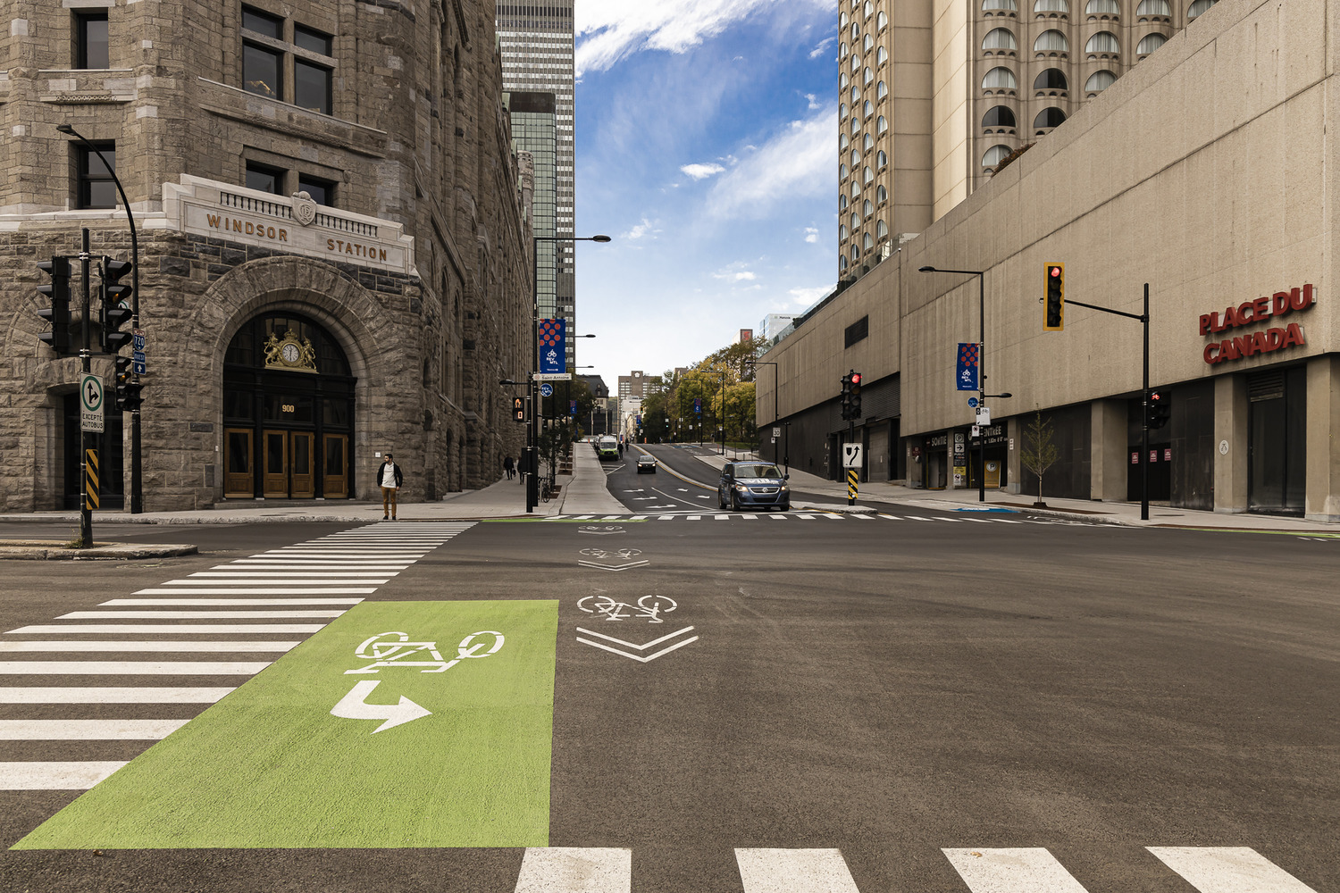 The City of Montreal selected Peel Street as an ideal location for a bike path. It is the first permanent section of Montreal’s Express Bike Network (EBN). Peel Street’s geometric redevelopment aimed to make the road more sustainable and inviting, prioritizing active transportation by adding two one-way concrete bike paths – among the first designed in Montreal.